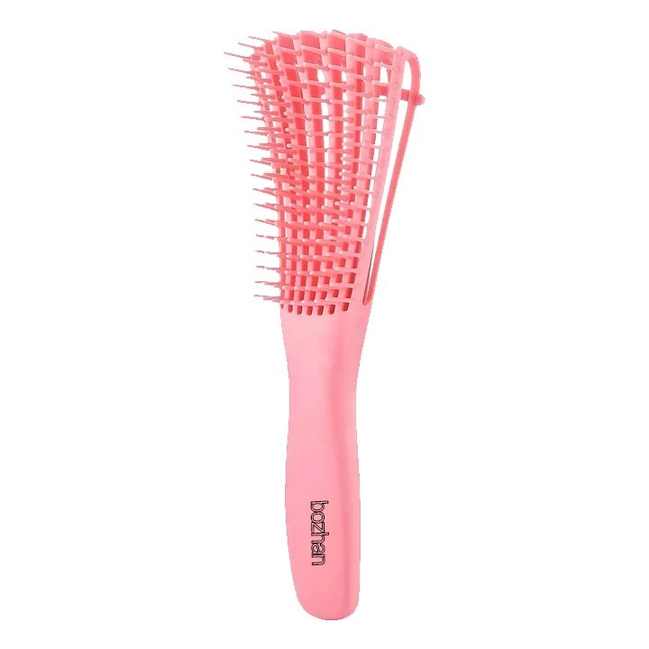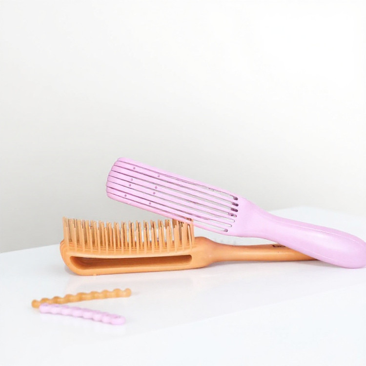 برس کرلی معروف به برس فلکسی اختاپوسی و مناسب باز کردن گره ی موهای فر ریز، فردرشت، موج دار و انواع مو فر است. جنس پلاستیک منعطف دارد و خیلی محکم وخوش دست است. چندین ردیف باریک دارد که با یک نوار به هم متصل میشوند و میتوانید از این نوار استفاده کنید. این برس یکی از محبوب ترین برس ها بین مو فرفری هاست، چون مو ها را نمیکشد و خیلی راحت ونوازشی گره های سخت مو ها را باز می کند. همچنین کارایی بسیار مناسبی برای انواع مو داشته و از کیفیت بالایی برخوردار می باشد. این برس را میتوانید تنظیم کنید. اگر موهای پر و کوتاهی دارید نوار پشتی برس را بالا تنظیم کرده و اگر موهای بلند و ضخیمی دارید نوار را پایین تنظیم کنید. نواری که روی شانه قفل شده از قسمت پشت شانه دو محل دارد که برای تنظیم می باشد.